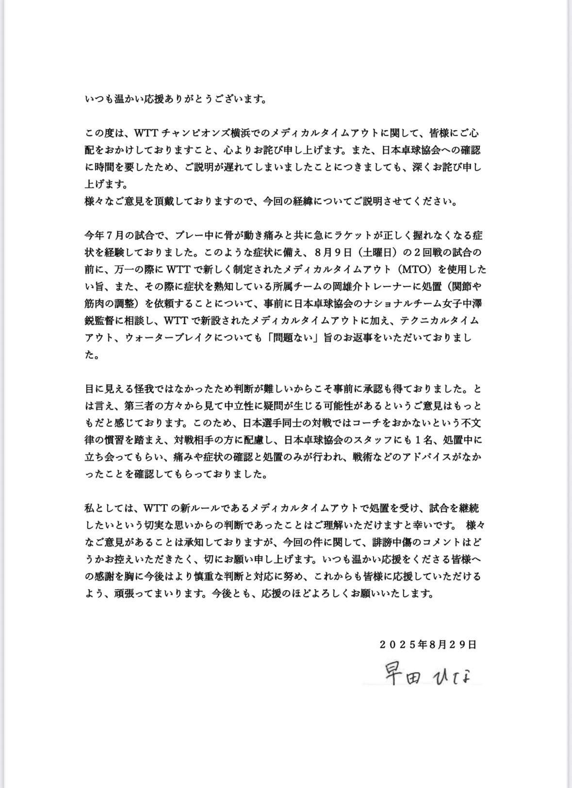 北京时间8月29日,针对在WTT横滨冠军赛女单第二轮比赛中的医疗暂停争议,早田希娜发布了声明。